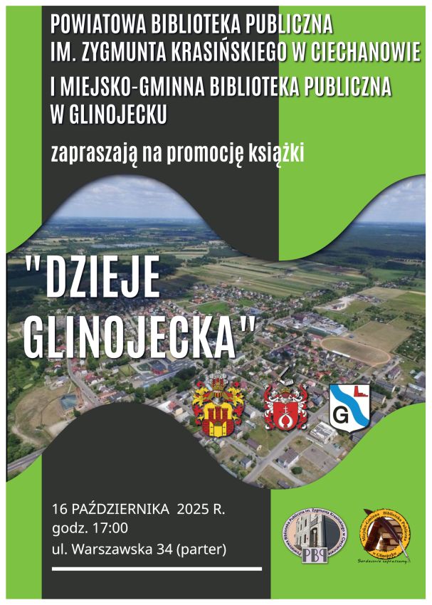 W dniu 16 października Miejsko-Gminna Biblioteka Publiczna w Glinojecku wraz z Powiatową Biblioteką Publiczną w Ciechanowie zorganizowała uroczystą promocję książki „Dzieje Glinojecka” autorstwa Radosława Lolo, Krzysztofa Wiśniewskiego, Leszka Zygnera, która została wydana z okazji 30-lecia nadania praw miejskich Glinojeck. Publikacja ta poświęcona jest historii miasta i jego mieszkańców. Wydarzenie przyciągnęło miłośników historii lokalnej, mieszkańców Glinojecka, przedstawicieli instytucji kultury oraz młodzież szkolną. Spotkanie rozpoczęło powitanie gości przez Pana Lecha Zduńczyka Dyrektora Powiatowej Biblioteki Publicznej w Ciechanowie, które poprowadziła Pani Grażyna Czaplicka Kierownik Działu Regionalnego PBP.