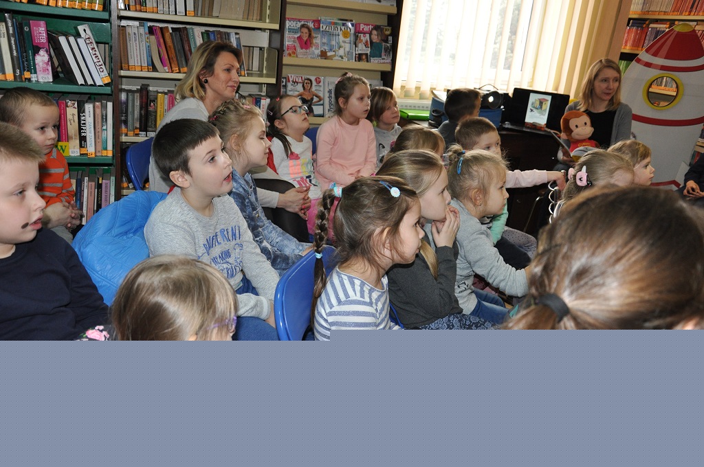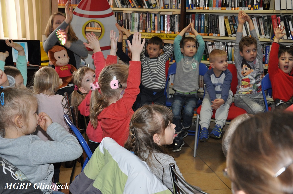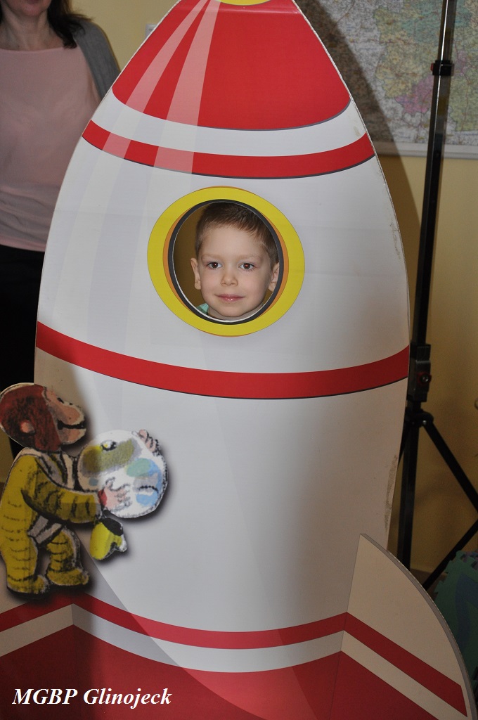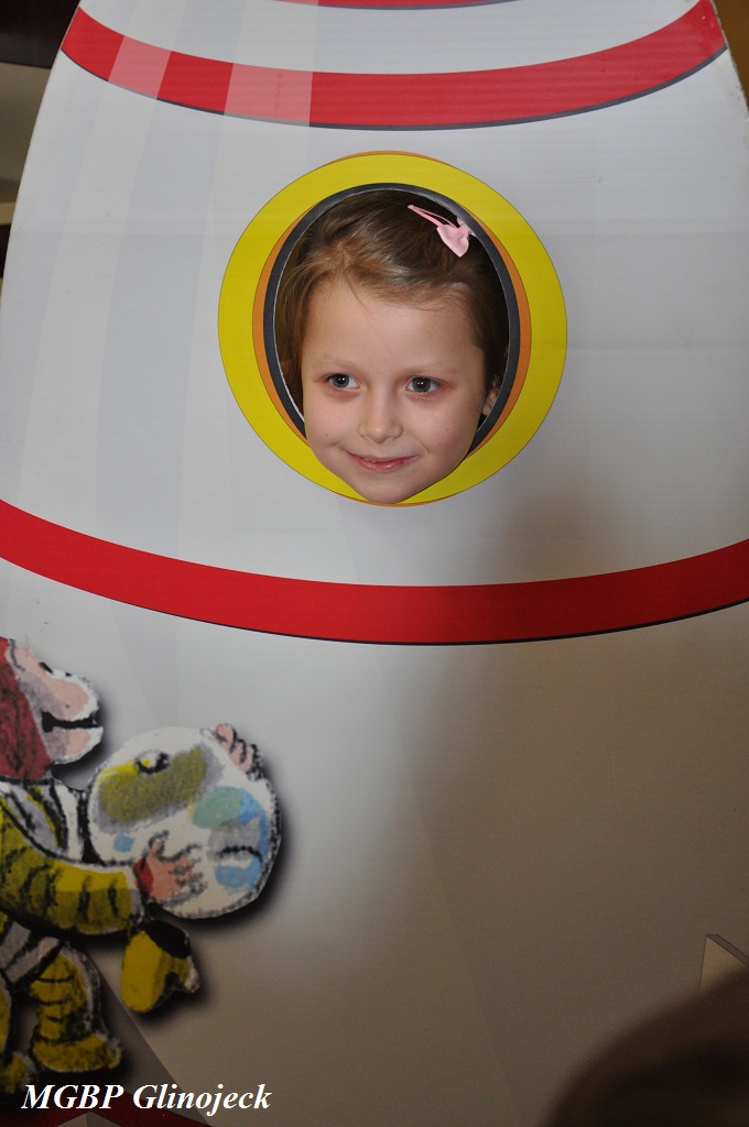 W Glinojecku „Małe Smerfy” dowiedziały się, że Ciekawski Geoge był pierwszą małpką w kosmosie, następnie mali astronauci poznawali kosmos i planety układu słonecznego: Merkury - Wenus - Ziemia - Mars - Jowisz - Saturn - Uran - Neptun – Pluton . Po kosmicznej eskapadzie dzieci obejrzały bajkę pod tytułem „Ciekawski George w Bibliotece”. Na koniec zajęć każde dziecko otrzymało pamiątkowy medal z wizerunkiem Georga oraz zostało sfotografowane w rakiecie.