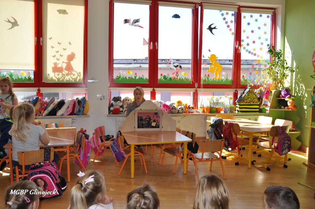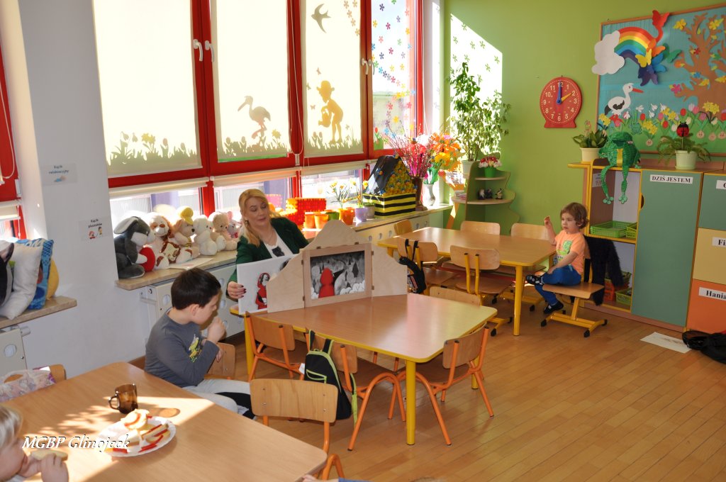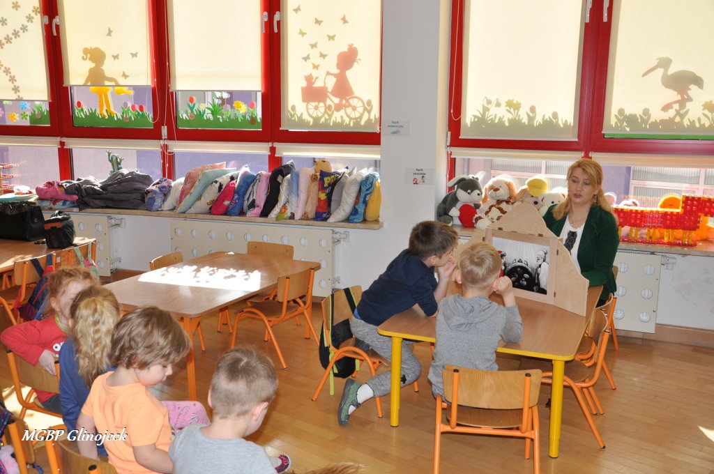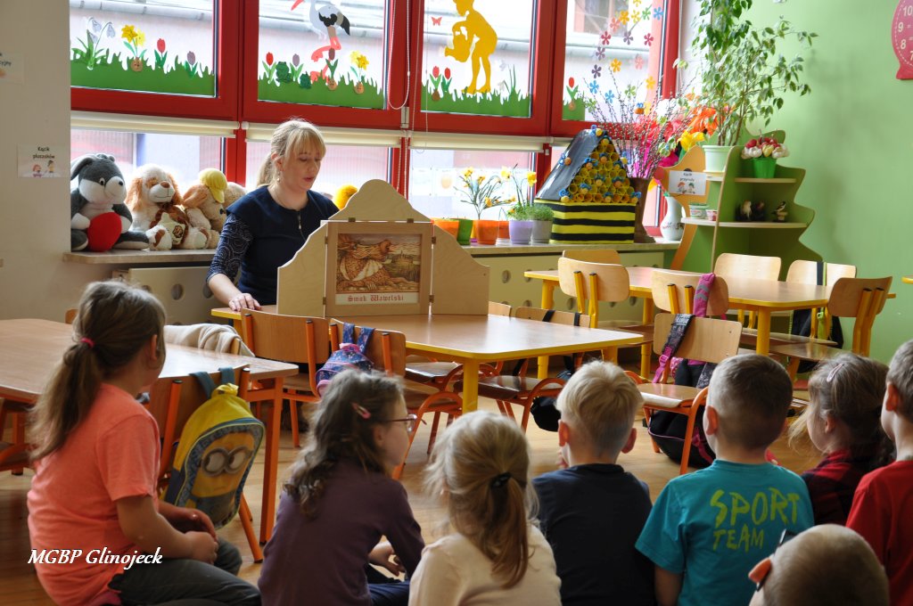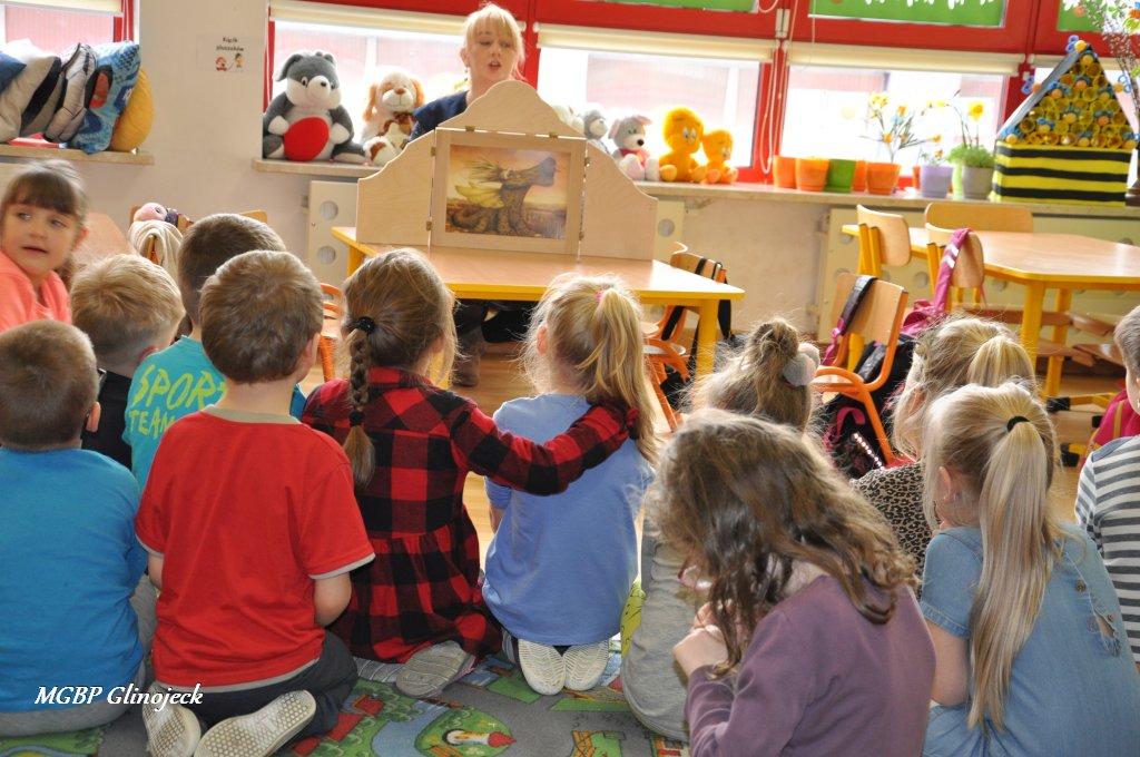 W Miejsko-Gminnym Przedszkolu w Glinojecku odbyły się trzy spotkania (22 marca, 26 marca, 2 kwietnia) podczas których dzieci wysłuchały bajki o „Czerwonym Kapturku", „Legendy o Smoku Wawelskim" oraz „Legendy o Skarbniku". W Ościsłowie odbyło się łącznie pięć lekcji bibliotecznych (26 marca oraz 4 kwietnia) oraz trzy lekcje dla przedszkolaków z Akademii Małego Smerfa (2 kwietnia). Podczas zajęć dzieci poznały magiczną skrzynkę kamishibai tzw. papierowy teatr obrazkowy. Jest to technika opowiadania, czytania wywodząca się z Japonii, wykorzystując plansze z obrazkami i tekstem oraz drewnianą lub kartonową skrzynkę (butai), - na wzór parawanu z teatrzyków marionetkowych – w której przedstawiane są kolejne fragmenty historii, bajki, opowiadania. Dzieci były bardzo zainteresowane nową formą czytania bajek, chętnie odpowiadały na pytania i brały udział w dyskusji. W formie dodatkowego zadania chętni uczestnicy zaprojektowali okładkę do wysłuchanych bajek.