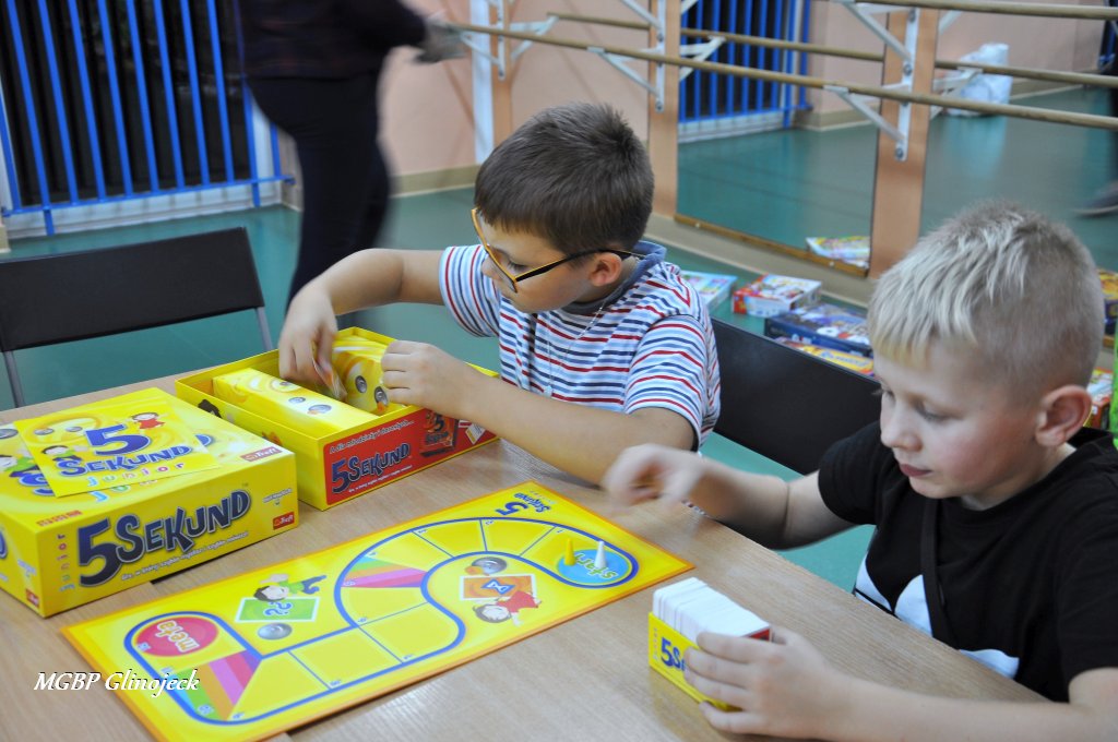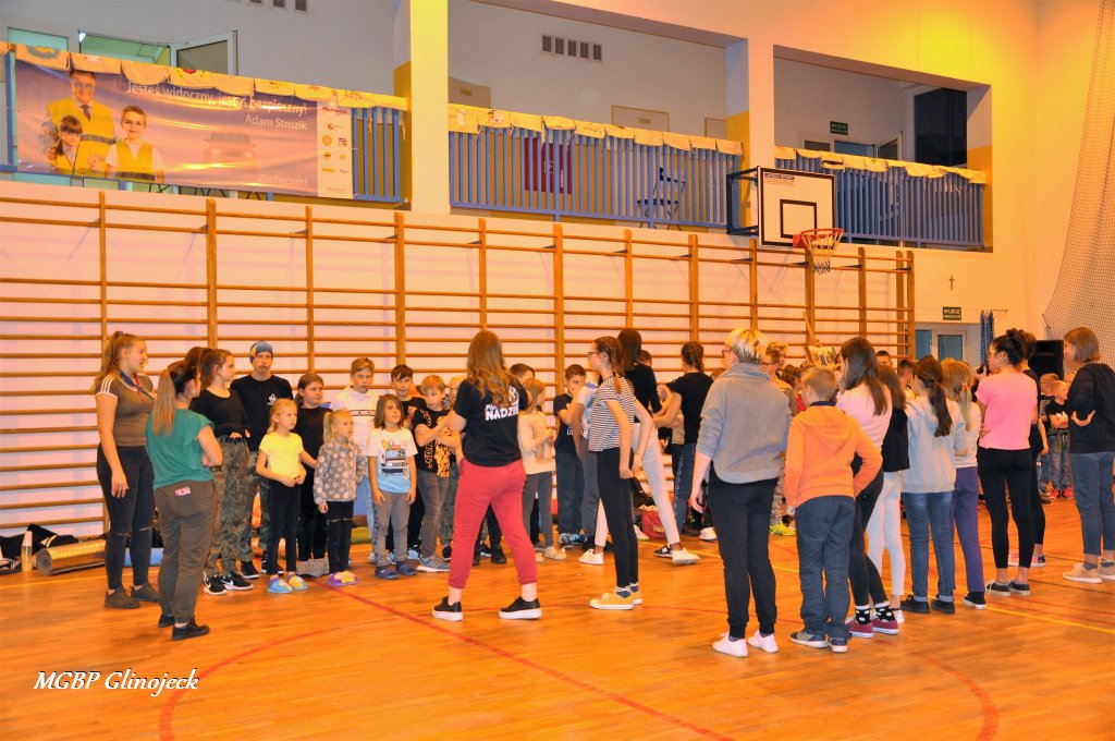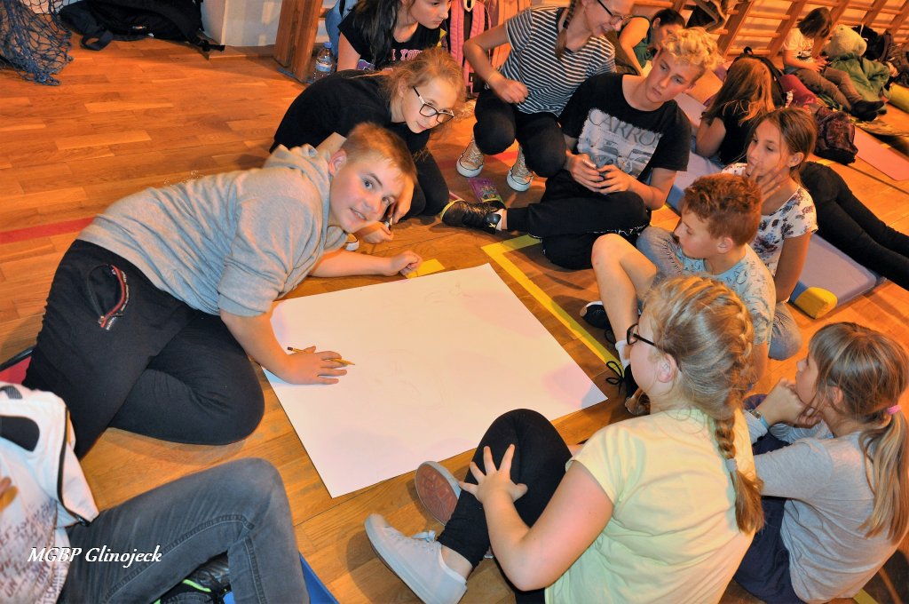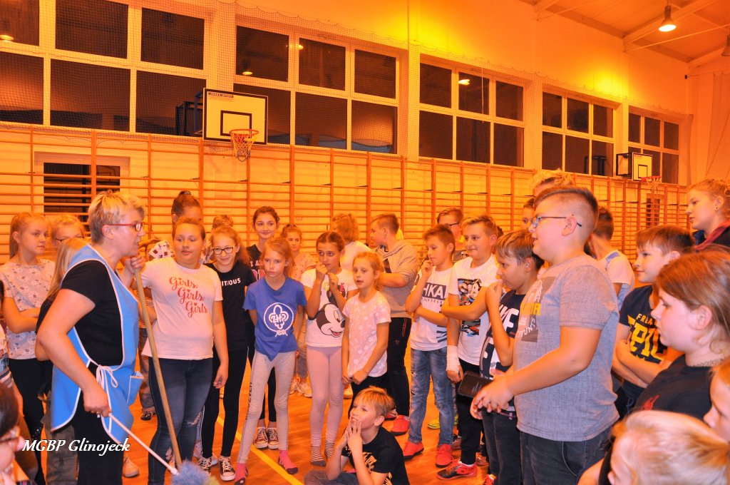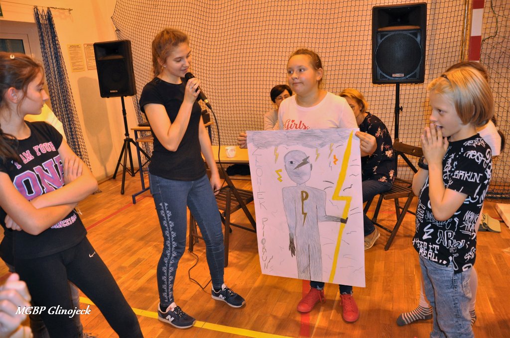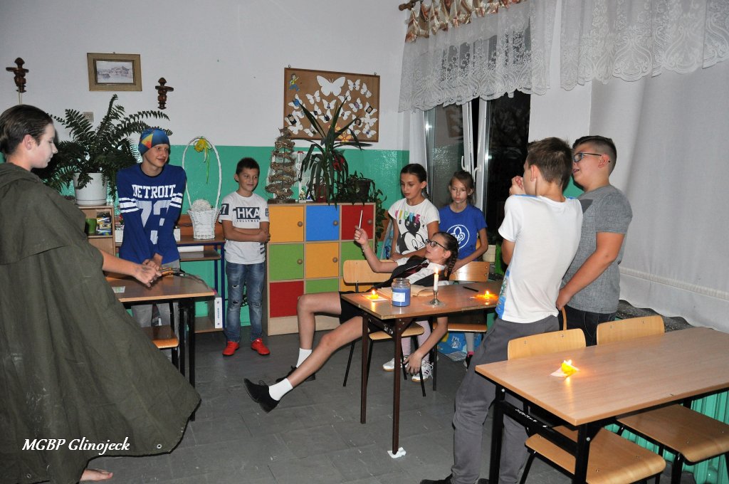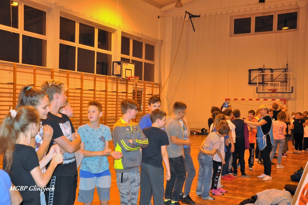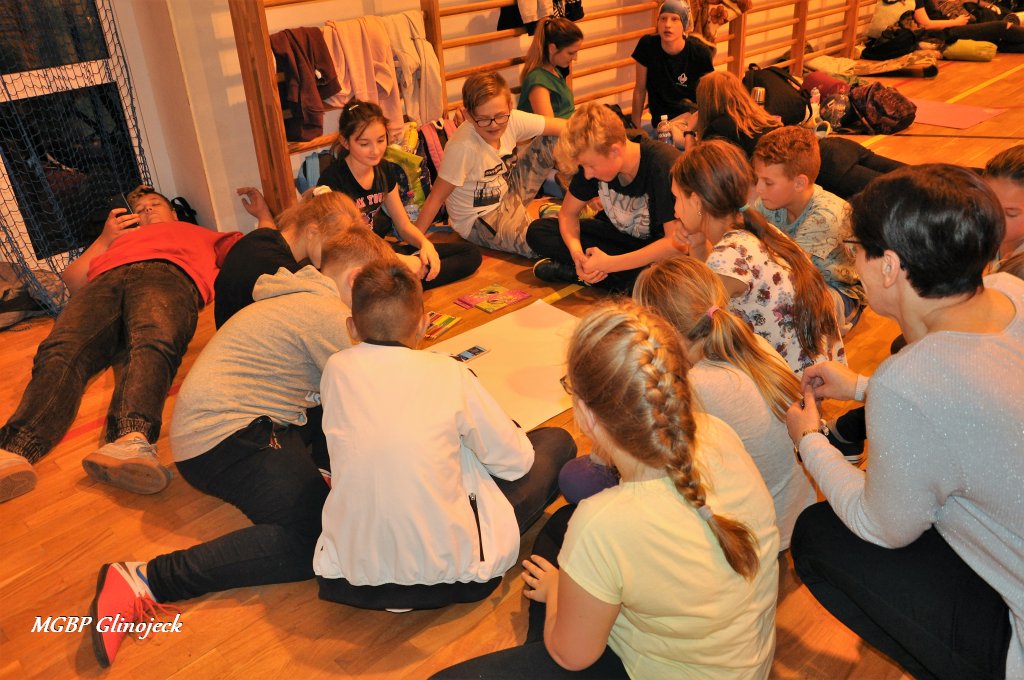 Kolejną atrakcją były zabawy ruchowe, które zapewnili druhowie z Glinojecka i Ościsłowa, porywając wszystkich do wspólnej zabawy. Nie zabrakło także gier planszowych tj.: 5 sekund, cluedo, monopoly junior i wielu innych oraz zabawy w komiks. Uczniowie podzieleni na cztery grupy mieli za zadanie stworzyć całkiem nowego bohatera bądź antybohatera komiksu. Musieli tylko uruchomić swoją fantazję. Powstały cztery świetne projekty i nowi bohaterowie, których potem młodzi twórcy musieli zaprezentować. O godz. 1.00 w nocy rozpoczęła się wyczekiwana przez wszystkich gra pt. „Magiczni bohaterowie książek", przygotowana przez harcerzy z Ościsłowa pod okiem drużynowej Pani Katarzyny Wachnik. Gra została opracowana na podstawie znanych bajek i powieści dla młodzieży. Odbywała się w 7 punktach rozmieszczonych po całej szkole. Było magicznie, kolorowo, momentami także upiornie. Nieco po północy, harcerze wcielili się w bajkowe i fantastyczne postacie, zaskakując uczestników zagadkami i zadaniami do wykonania. Po skończonej grze najwytrwalsi z najwytrwalszych obejrzeli film pt. „Ptyś i Bill".
