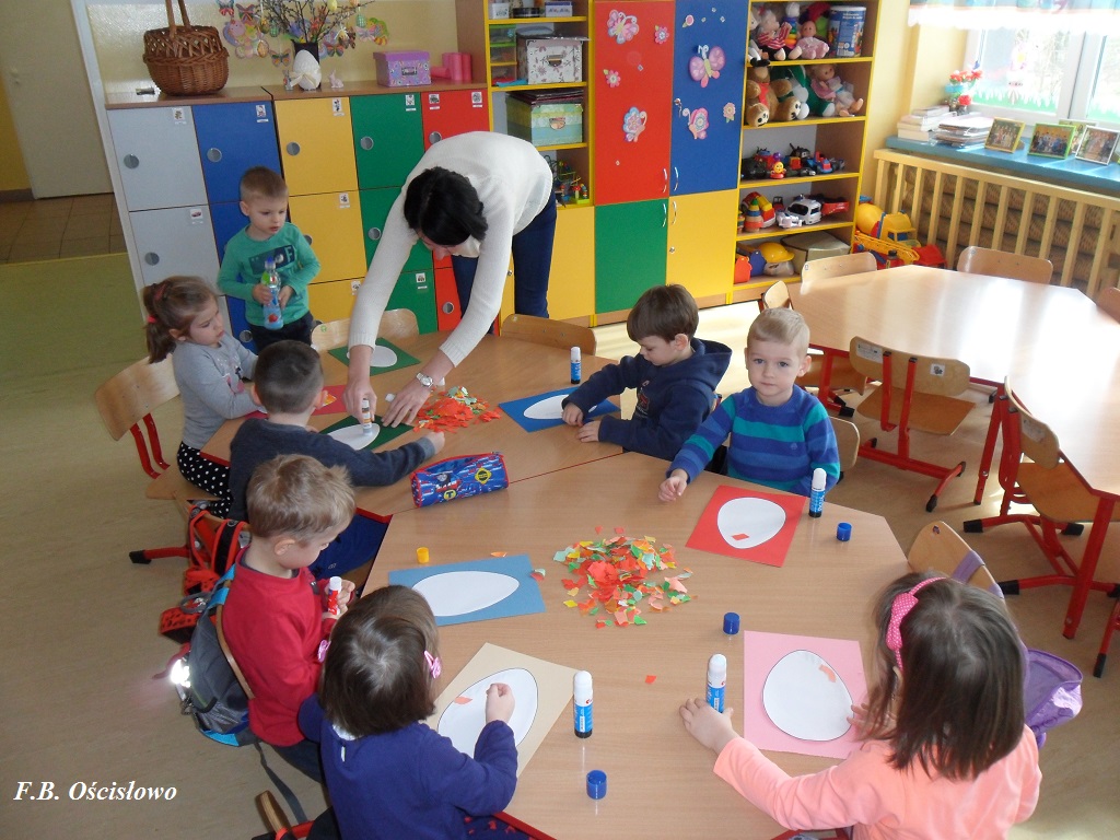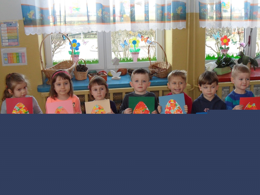Po zakończeniu pierwszej części dzieci udały się do sali przedszkolnej gdzie wykonały piękne pisanki-wydzieranki. Prace dzieci można oglądać w Filii Bibliotecznej.