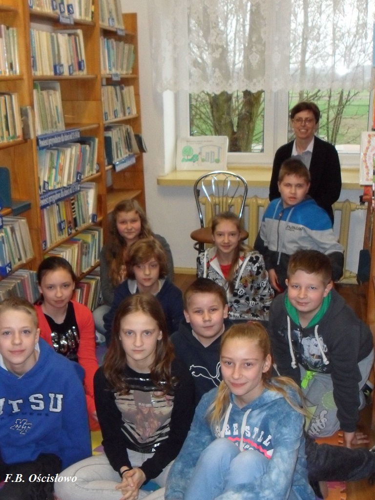 Dnia 06.04.2016 roku w Filii Bibliotecznej w Ościsłowie odbyła się lekcja biblioteczna z klasą V z Zespołu Szkół Ogólnokształcących w Ościsłowie. Zajęcia były podzielone na dwa bloki tematyczne. Pierwsza część poświęcona była historii polski druga zaś drodze książki od pisarza do czytelnika w XXI wieku. W lekcji udział wzięło 10 dzieci wraz z panią Elżbietą Niszczotą nauczycielem języka polskiego i bibliotekarzem w ZSO.