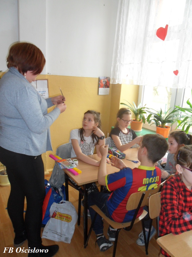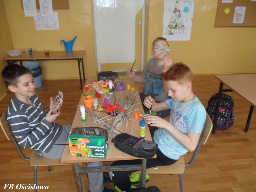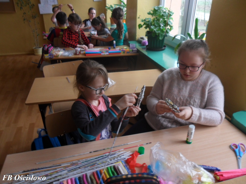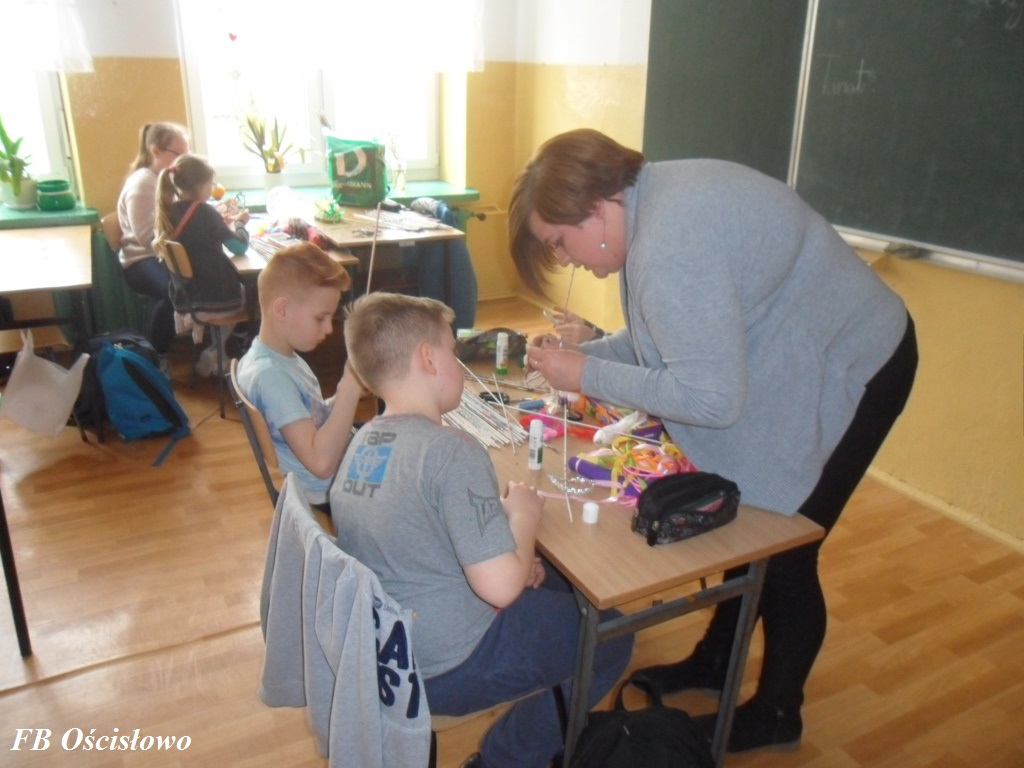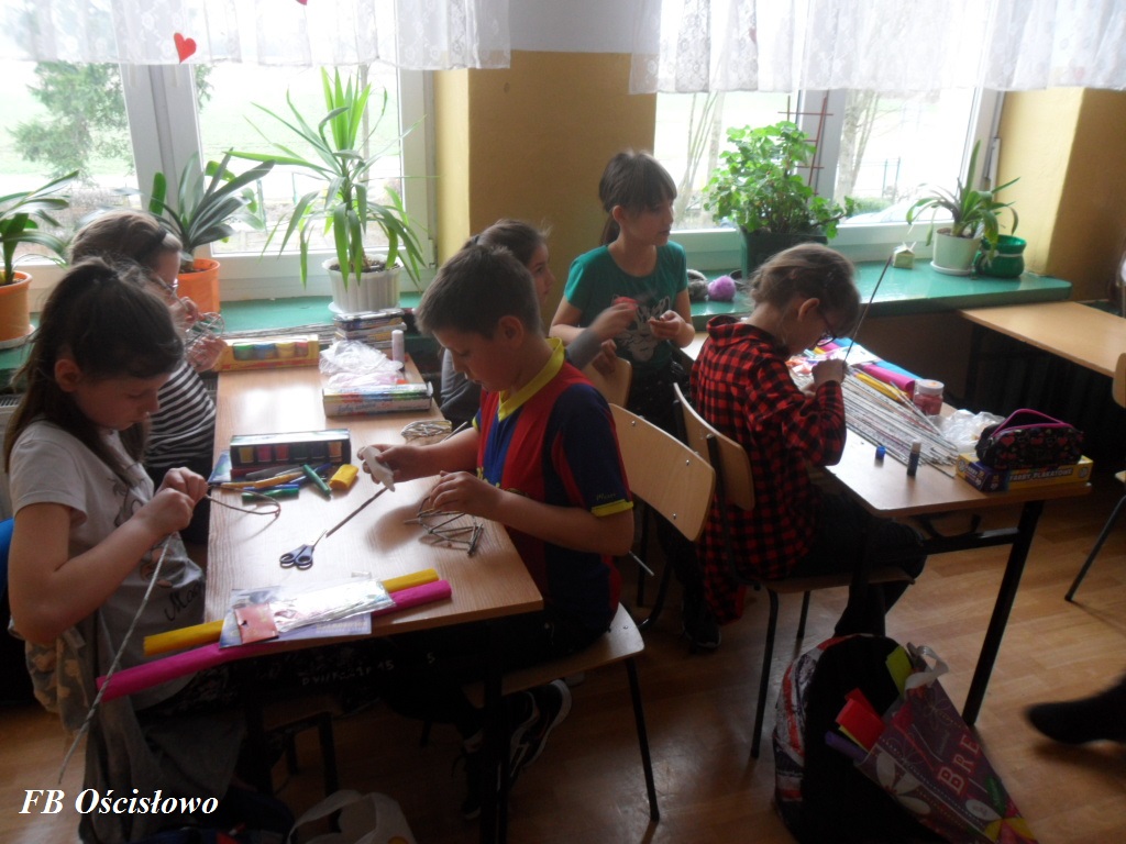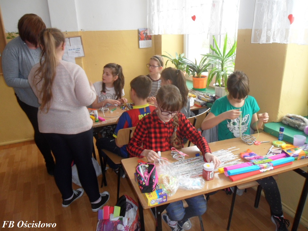 Dnia 28.03.2017 w ramach współpracy pomiędzy Biblioteką Szkolną w Ościsłowie a Filią Biblioteczną w Ościsłowie odbyły się już drugie zajęcia plastyczne tym razem z klasą IV S P. W zajęciach udział wzięło 11 uczniów. Tematem zajęć była Wielkanocna ozdoba wiklinowa.
