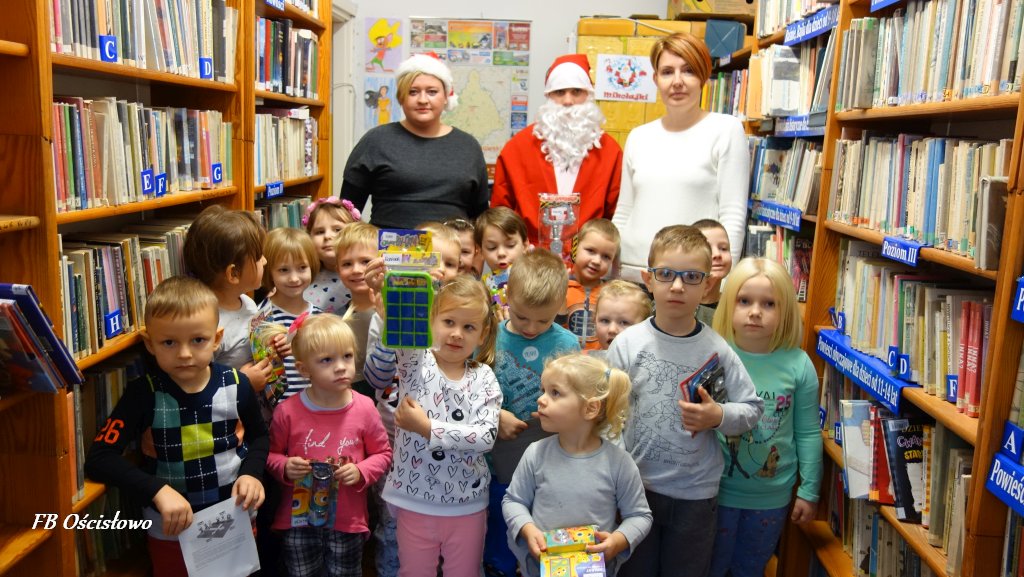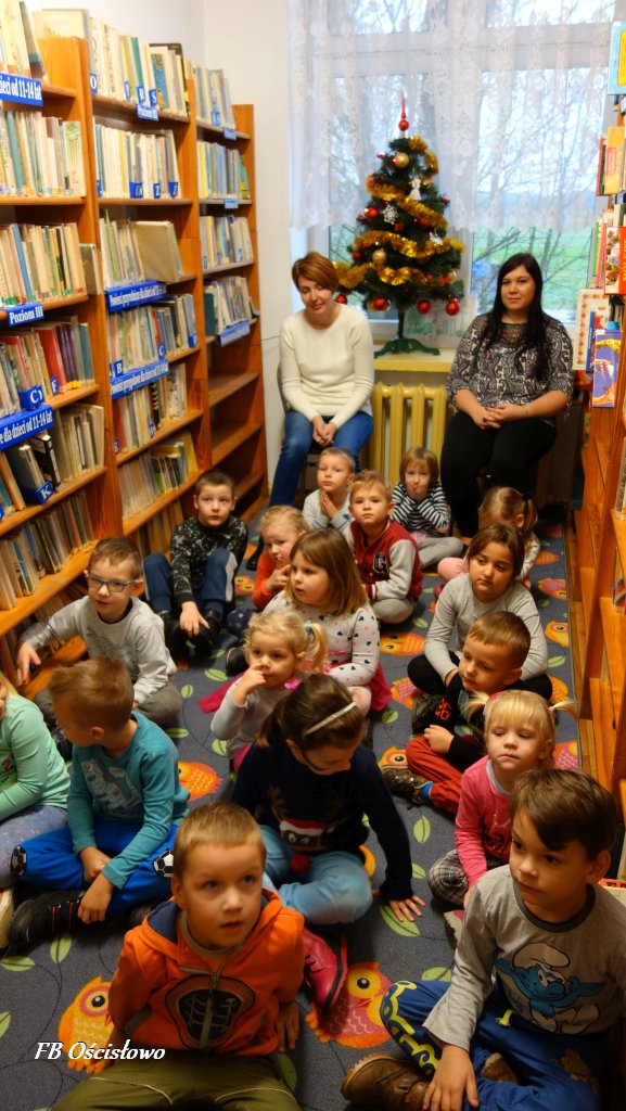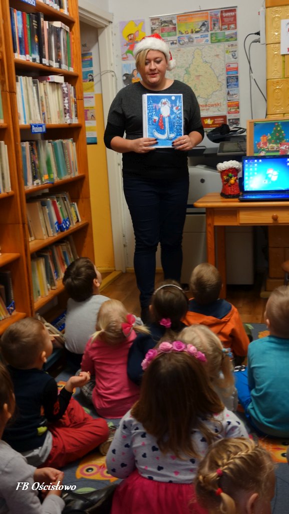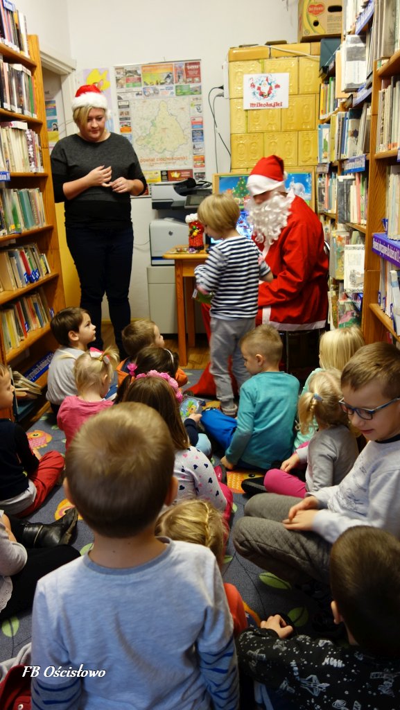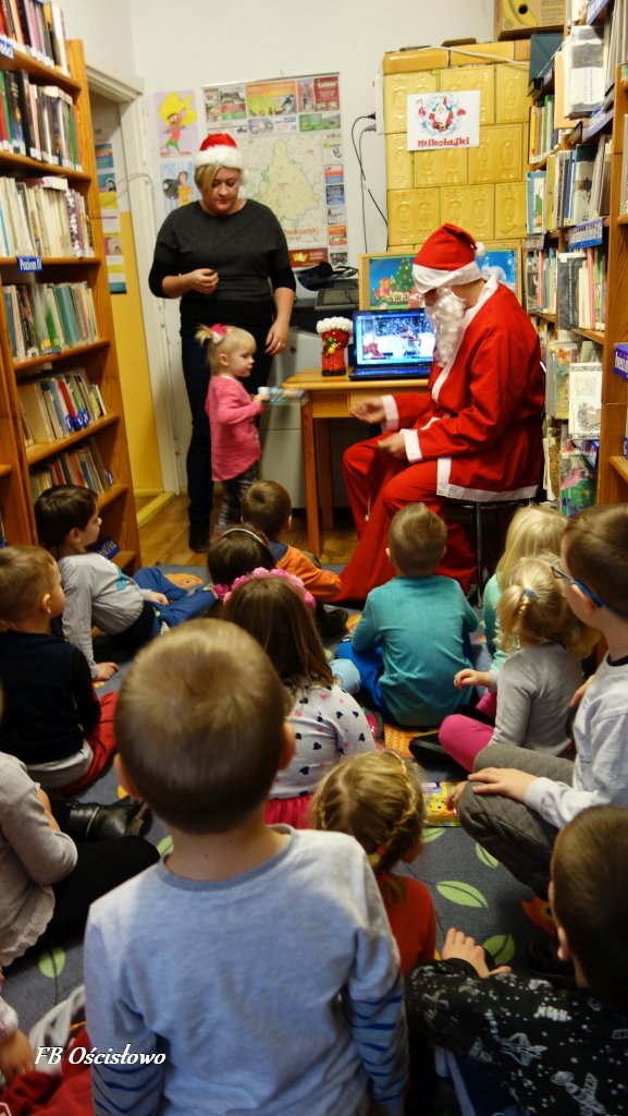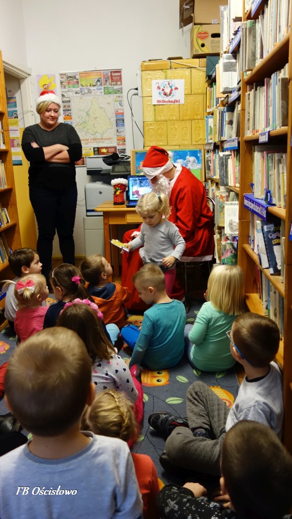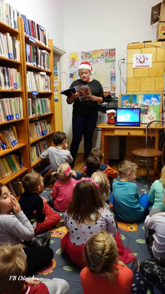 Dnia 07.12. 2017 w Filii Bibliotecznej w Ościsłowie odbyła się lekcja biblioteczna z dziećmi z punktu przedszkolnego przy szkole podstawowej w Ościsłowie. W zajęciach udział wzięło 17 przedszkolaków wraz z paniami Martą Perczyńską i Dominiką Jasińską. Celem zajęć było przybliżenie dzieciom postaci Świętego Mikołaja i poznanie zwyczajów mikołajkowych w innych krajach. W postać świętego Mikołaja wcielił się Kacper Śmigielski uczeń II klasy gimnazjum z SP w Ościsłowie.