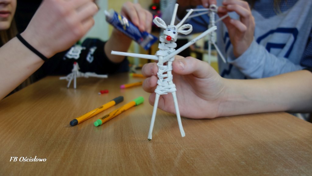 Uczniowie klasy VII po raz drugi zetknęli się z wikliną papierową. Techniką pozwalającą ze starych gazet tworzyć śliczne plecionki. Tym razem wyplataliśmy renifery, które będą ozdobą choinki. Siódmoklasiści poinstruowani krok po kroku poradzili sobie świetnie z zadaniem i powstało sympatyczne stadko reniferów czerwononosych.