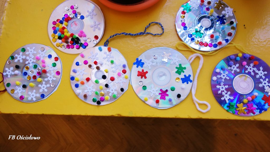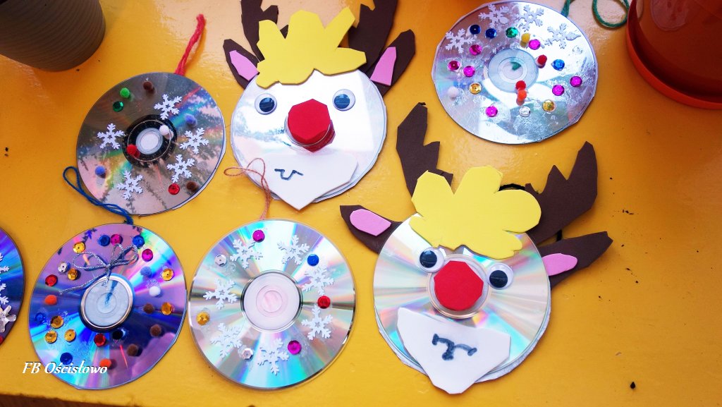 Własnoręcznie wykonane ozdoby przynoszą wiele satysfakcji. Bardzo interesującym pomysłem, który wykorzystaliśmy na zajęciach, są bombki z płyt CD/DVD. Wykonanie bombek jest dość proste za to efekt jaki otrzymamy może zachwycać. Płyta z jednej strony mienie się w świetle, więc doskonale nadaje się pracy, a przy okazji dostaje drugie życie zamiast trafić do kosza Aby wykonać bombki potrzebne będą: zużyte płyty CD i DVD, ozdoby – brokat, cekiny, błyszczący papier, dobry klej, np. Magic, nożyczki, bibuła, naklejki ze świątecznymi motywami, sznurek i wiele innych. Uczniowie po otrzymaniu części materiałów (ozdób) ochoczo przystąpili do pracy i wykonali cudne bombki i renifery, które za jakiś czas zawisną na klasowej choince.