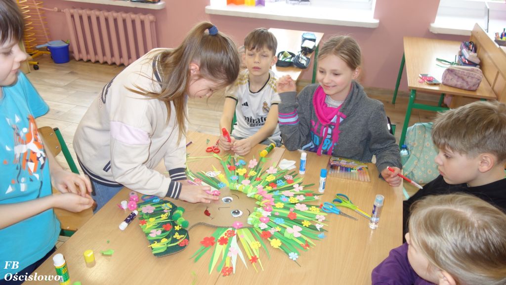 Zajęcia zostały dostosowane do wieku uczestników: Dzieci z punktu przedszkolnego i zerówki wykonywały pisanki z tekturki. W środku umieszczały taśmę klejącą, a następnie wyklejały je kolorowymi materiałami, tworząc barwne dekoracje. Uczniowie klasy I przygotowywali zajączki z tektury. Prace były wyklejane, a następnie mocowane na patyczkach, co nadawało im formę dekoracyjną. Klasa II wykonywała zajączki na bazie rolek po ręcznikach papierowych, tworząc przestrzenne ozdoby Wielkanocne. Uczniowie klasy III tworzyli kurki na bazie trójkątnej tekturki. Wyklejali je papierowymi „piórkami”, a następnie dodawali oczy, dziób i grzebyk. Gotowe prace były mocowane na patyczkach. Klasa IV przygotowywała kurczaczki na tekturce, które następnie były owijane żółtą włóczką, co nadawało im ciekawą fakturę i efekt wizualny.